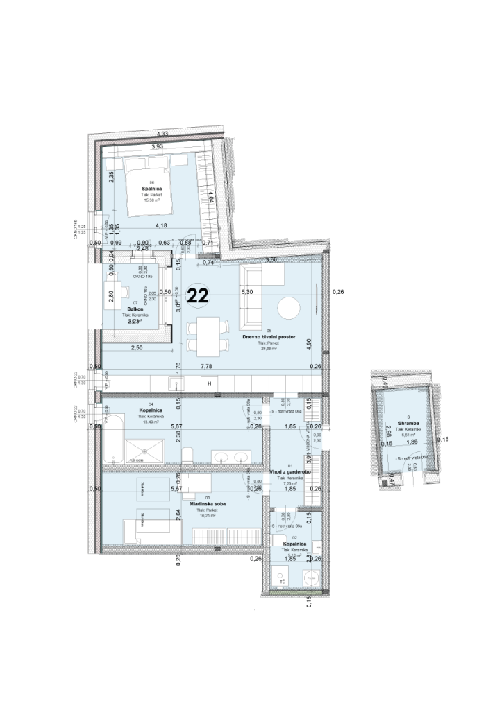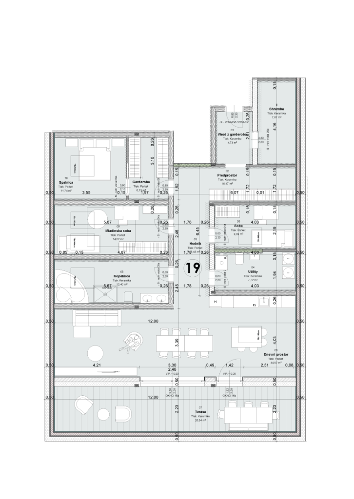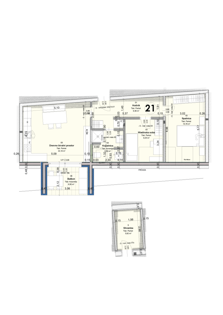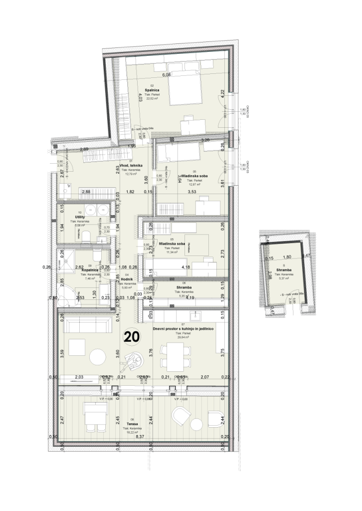 Podatki in tlorisi, ki jih vsebuje spletna predstavitev, so zgolj informativne narave. Točne mere se lahko od projekta do zaključene verzije minimalno spremenijo. Kupec je dolžan pred nakupom nepremičnine vse pomembne podatke skrbno preveriti.